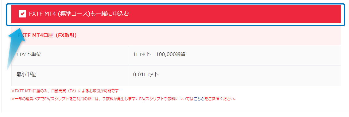 EAを使用するためには、MT4口座が必要なのでこちらにもチェックを入れてください。