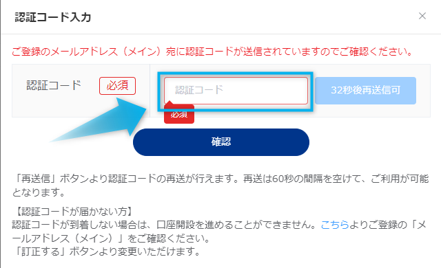 入力したメールアドレスに認証コードが届きますので、そちらを入力して確認を押してください。