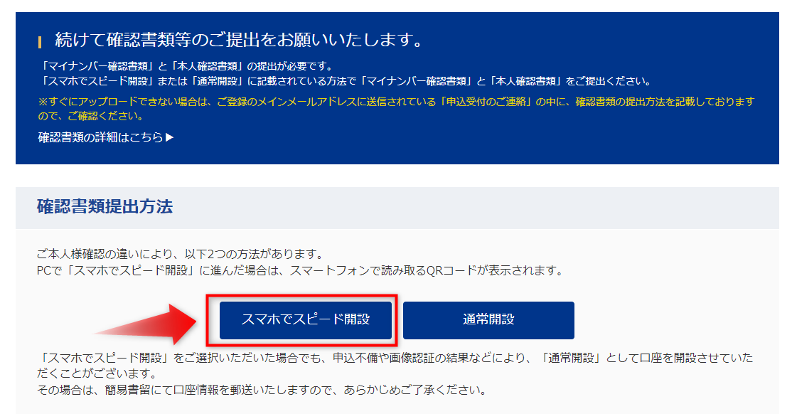 提出は「スマホでスピード開設」と「通常開設」の2つあります。