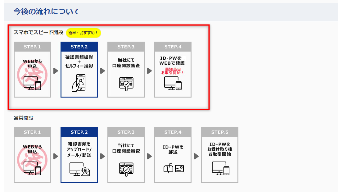 「スマホでスピード開設」をクリックすると、書類提出の流れが表示されます。