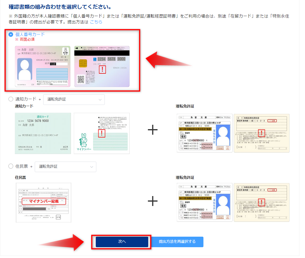 もしお持ちであるなら、マイナンバーカードが一番簡単(表・裏・斜めを撮影するだけ)です。